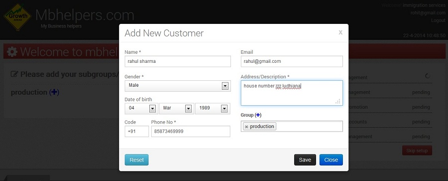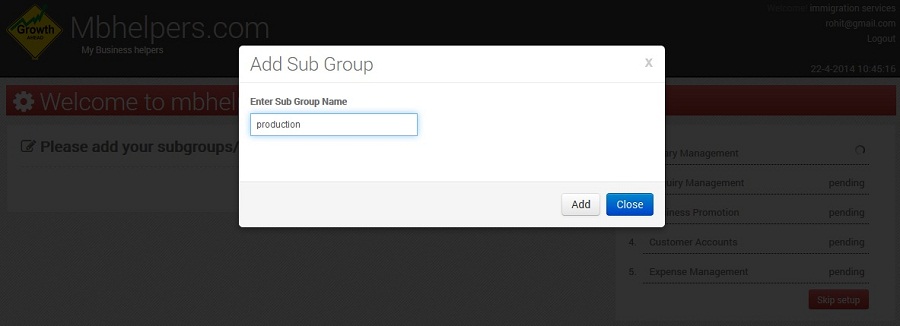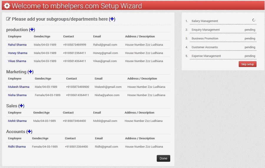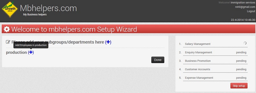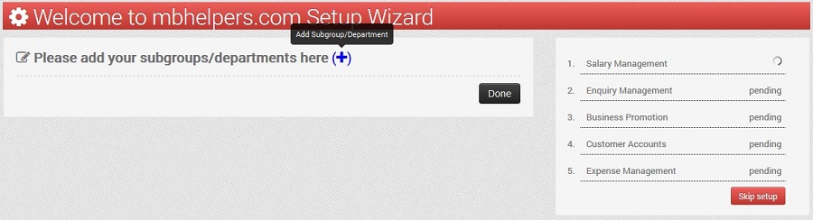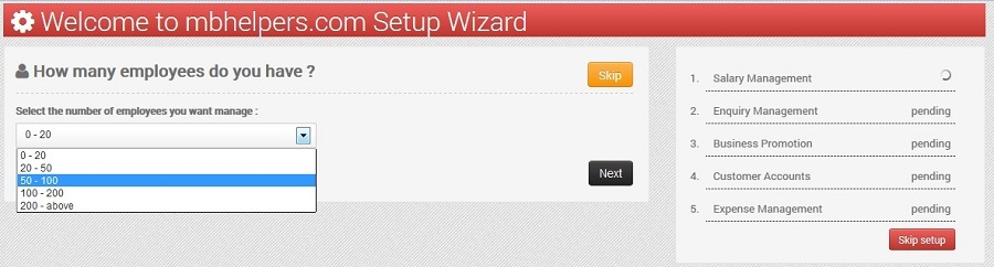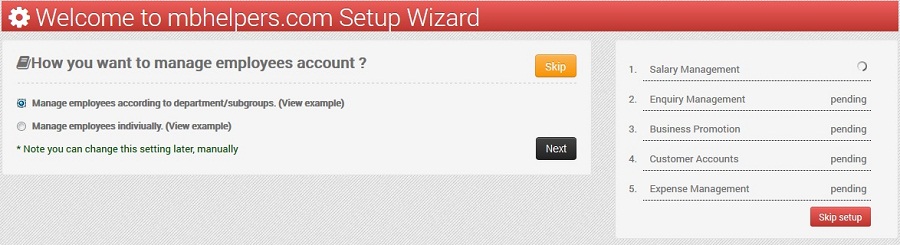 After Login Mbhelpers the first screen appears is setup wizard where you have to setup for various tasks like Salary/Employee management, Inquiry Management, Business Promotion, Customer account & Expense management etc.